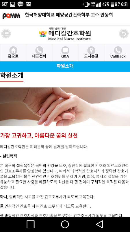 본 학원의 설립목적은 국민의 건강을 보호, 증진함에 필요한 간호와 의료보조인력인 간호조무사를 양성함에 있습니다. 따라서 과학적인 간호지식과 정확한 간호기술을 교육함은 물론 전인적인 간호행위를 위하여 사랑, 희생, 봉사의 철학을 가진 유능하고 필요한 사랑을 베출하도록 최선을 다 할 것이며 구체적인 목적은 다음과 같습니다.
