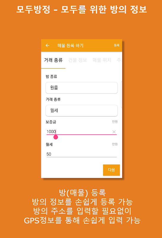 방 구하러 다닐 때 필수 어플 - 모두방정 ■ 부동산 정보 ■ 방 정보 입력 ■ 부동산 및 방의 정보 지인들과 공유
