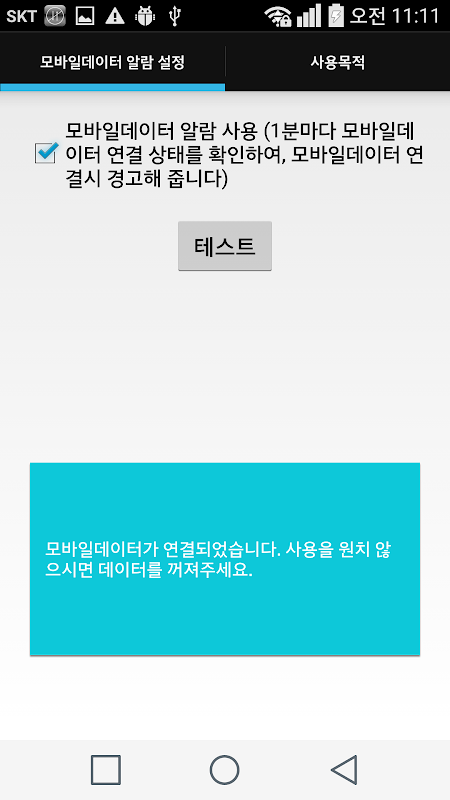 3g/4g/lte 등의 모바일데이터 사용을 원하지 않는 경우, 의도치 않은 데이터 사용을 방지 할 수 있도록 미리 경고해 줍니다. (데이터 차단 부가서비스 가입이 어려운 경우 사용)
