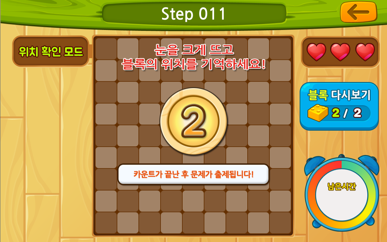 위치 및 색깔 모드 : 제시된 화면을 보고 위치와 모양 그리고 색깔까지 맞추는 모드입니다.
