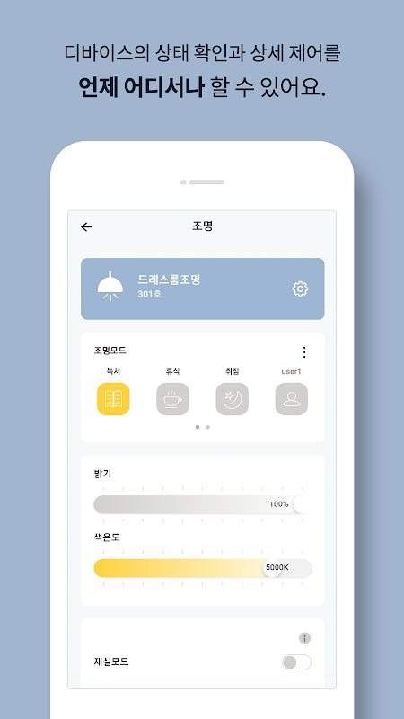 Grâce à des appareils IoT achetés et enregistrés, vous pouvez vérifier l'état de votre maison et de vos membres à tout moment, n'importe où, et vous pouvez utiliser de manière pratique et intelligente divers appareils IoT, de l'éclairage aux capteurs pour une vie pratique et sûre en fonction de votre style de vie.