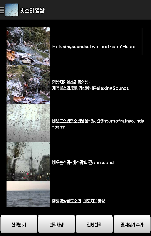 비오는소리, 계곡물소리, 파도소리, 바람소리, 흙밟는 소리가 소리와 영상으로 제공됩니다.