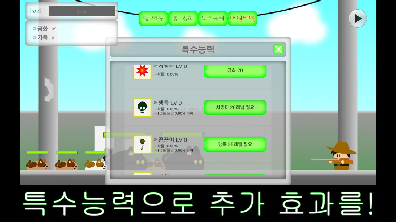 사냥꾼을 키워서 더 강한 몬스터를 사냥하자! 총을 강화하고 특수능력을 배워서 더 강한 사냥터로 나아가자! 엄청나게 쉬운 사냥 방식의 키우기!