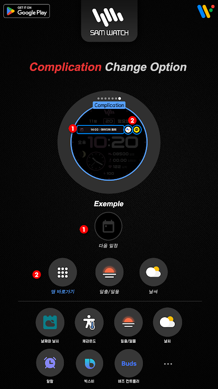 * L'application pour smartphone est une application supplémentaire dans l'application Watchface qui explique le guide de téléchargement. Il peut être différent de la capture d'écran du cadran de l'application pour smartphone et de la capture d'écran du cadran réellement téléchargée. La plupart des produits d'application Watchface de SamWatch incluent des applications pour smartphones.