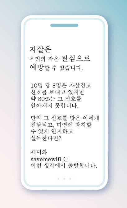 "자살예방어플리케이션-세미와" 를 통해 더많은 사람들이 자살예방에 함께 극복해나가고 해결하고자 합니다. 여러분의 많은 격려와 참여 부탁드립니다.