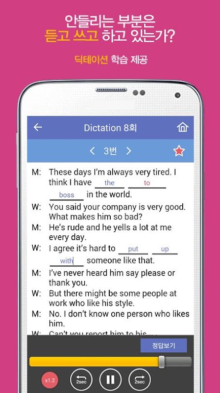 ▶ 영어듣기 훈련 뿐만 아니라 딕테이션을 통해 어휘 및 독해의 부가학습까지 혼자서 끝내는 자기주도 학습 앱