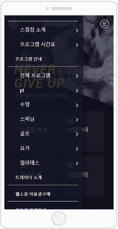 스윙투앱으로 제작된 헬스클럽 , 피트니스센터 샘플앱입니다.