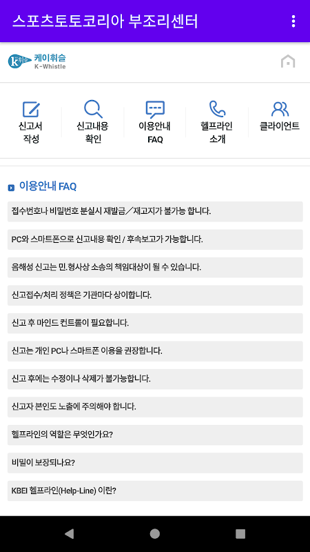 스포츠토토코리아 부조리신고센터는 내부 임직원 혹은 외부 이해관계자가 안심하고 신고 할 수 있는 부정부패 신고 APP입니다.