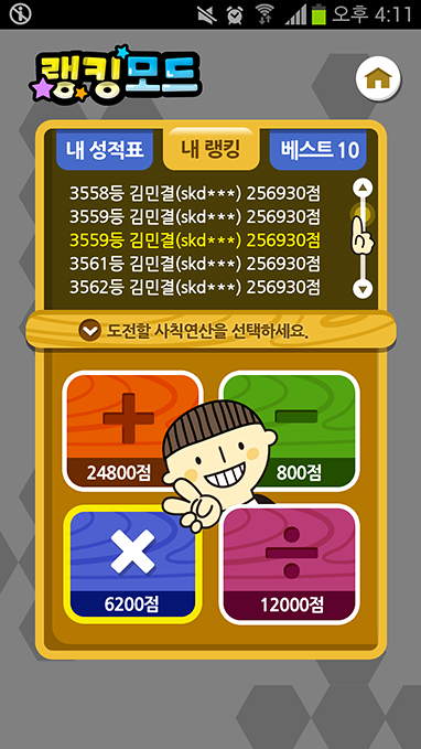 랭킹 모드는 초등학생들이 자기 학년의 다른 학생들과 순위 경쟁을 하는 게임의 형태로 아이디와 비번을 만들고 학년을 지정하면 해당 학년 수준에 해당하는 문제를 10초안에 풀도록 만들어져 있습니다.