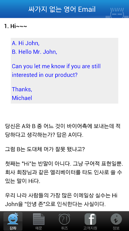 이 앱은 외국계 기업, 국내 대기업 북미 담당을 거쳐 현재 북미 대기업에 재직하고 있는 '싸가지'씨의 경험을 바탕으로 영문 이메일 작성을 통한 생생한 현지 영어와 “영어다운” 영작문을 배울 수 있는 기회를 제공합니다.