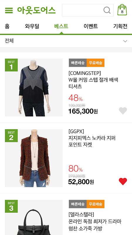 카테고리 신상품 정보, 아웃도어 컨텐츠정보, e쿠폰.