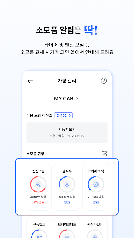 Gérez votre assurance automobile. Si vous ajoutez les informations de votre compagnie d'assurance dans l'écran de gestion du véhicule, nous vous aiderons à gérer votre assurance automobile, y compris les notifications de date d'expiration de l'assurance. De plus, si vous souscrivez au contrat spécial iNavi Connected Black Box de Samsung Fire & Marine Insurance, nous vous fournirons des services de gestion d'assurance plus détaillés, tels qu'un lien détaillé avec des informations sur le véhicule et des réductions sur les primes d'assurance.