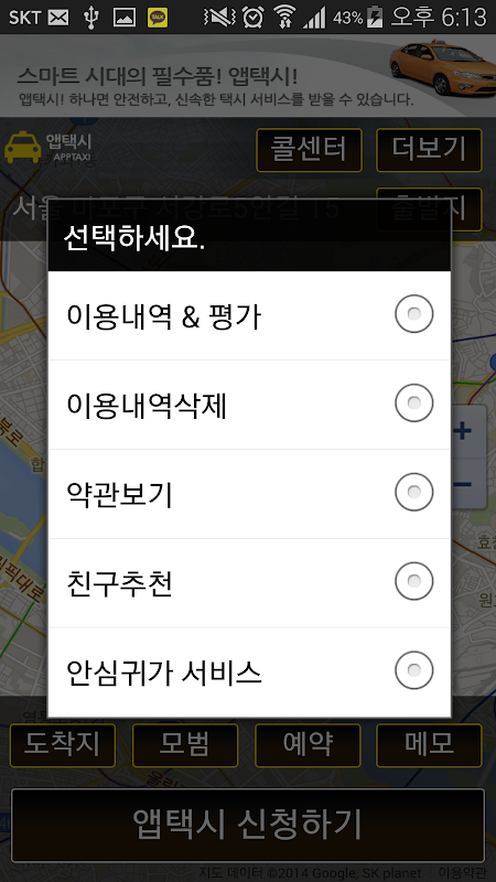 3. 앱택시 신청하기를 꾹~~~ 눌러 택시를 요청합니다.
