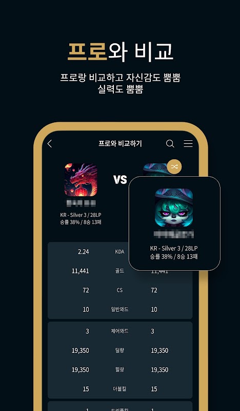 De mon invocateur à la comparaison des performances de l'invocateur adverse ! Si vous êtes curieux de comparer avec les pros fournis uniquement par notre application, venez Drew !