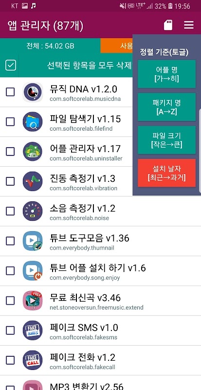 - 앱 최신설치순 용량순 이름순등으로 소팅 지원