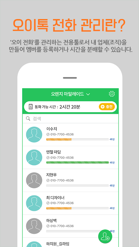 오이 전화 관리는 오이톡 전화 서비스인 '오이 전화'를 관리하는 전용툴로서 업체(조직)를 만들어 멤버를 등록하거나 시간을 분배할 수 있습니다.