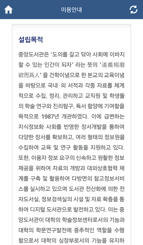 Grâce à l'application, vous pouvez utiliser les mêmes services fournis par la bibliothèque, tels que le guide de l'utilisateur, la recherche intégrée, la demande de location de livre et la demande de report, et la réservation à tout moment, n'importe où.
