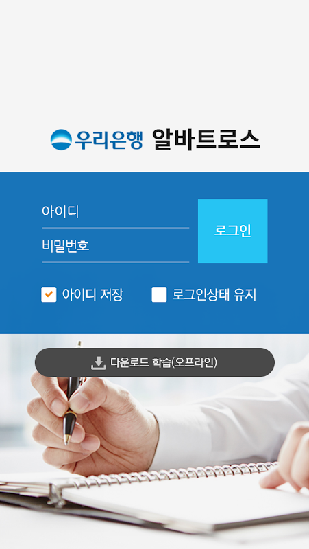 PC환경의 우리은행 연수원 (http://wooribank.hunet.co.kr)의 아이디와 비밀번호로 로그인 가능하며, 주요 서비스를 본 모바일 앱에서도 사용하실 수 있습니다.