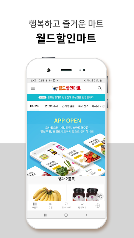 월드할인마트 고객을 위한 모바일 어플리케이션입니다.모바일쇼핑, 할인쿠폰, 영수증, 세일정보 확인 등 다양한 서비스를 이용할 수 있습니다.