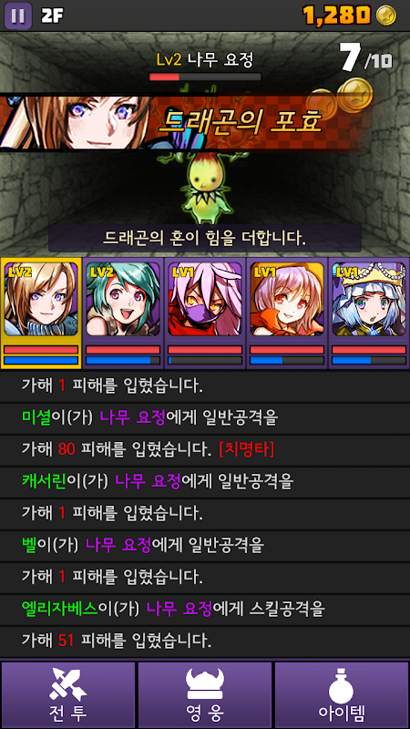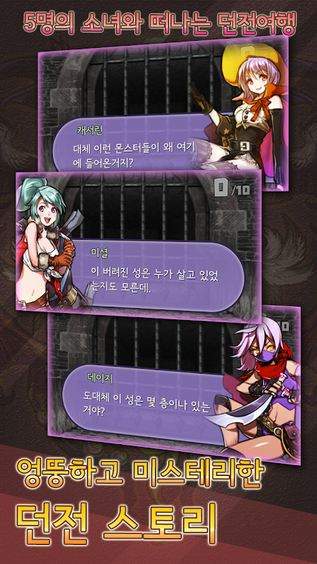 1. 던전탐험 : 몇 층인지도 모르는 끝없는 던전을 탐험하면서 몬스터를 물리치고 금화와 아이템을 보상으로 얻습니다.