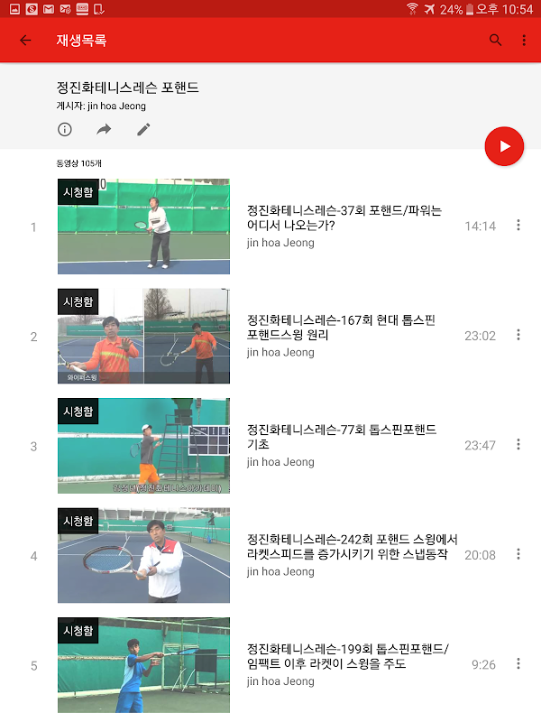 Jeongjinhwa playlists YouTube et trier par tennis de la technologie des leçons de tennis et amateurs de tennis ont fait des vidéos pour un accès facile.
