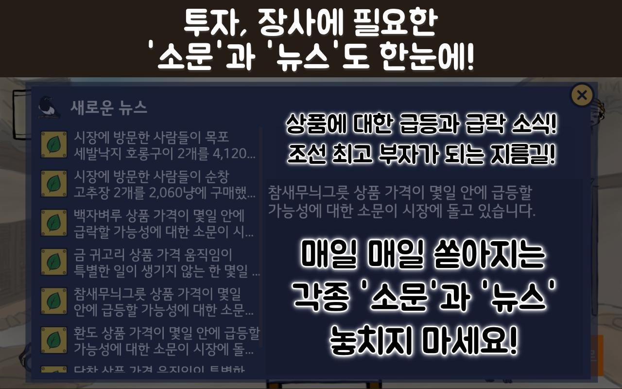 De plus, ce jeu présente non seulement des produits du jeu qui peuvent être échangés à tout moment, mais aussi le concept d'un marchand de marché de 5 jours qui apparaît sur le marché de 5 jours, un marché traditionnel représentatif en Corée et un noir agent marchand du marché qui travaille en secret.