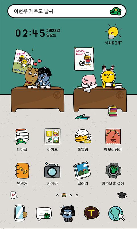 카카오홈 '카카오프렌즈 캠퍼스라이프 III' 열기 또는 홈 화면에 있는 '테마상자' 폴더에서 적용하실 수 있답니다 :3