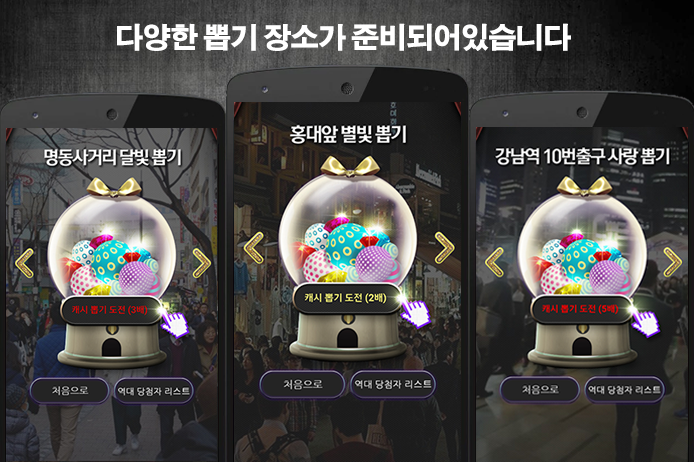 매일 어플을 실행하시면 밤 12시 기준으로 랜덤으로 1~3장의 캐시 뽑기권을 드립니다.