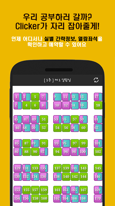 Clicker는 전자도서관 전체 시설관리를 위한 시스템 (Smart Library Management System) 으로서 Kiosk, PC, Tablet, Smart Phone등 모든 기기를 이용해 동일한 인터페이스로 열람좌석, 세미나룸, 멀티미디어룸, 사물함 등의 시설을 이용자와 연결해 주는 시스템 입니다.