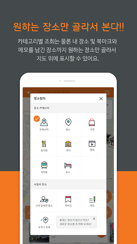 찾는 여행지가 없다면 내가 원하는 장소를 직접 등록하여 관리할 수 있습니다.