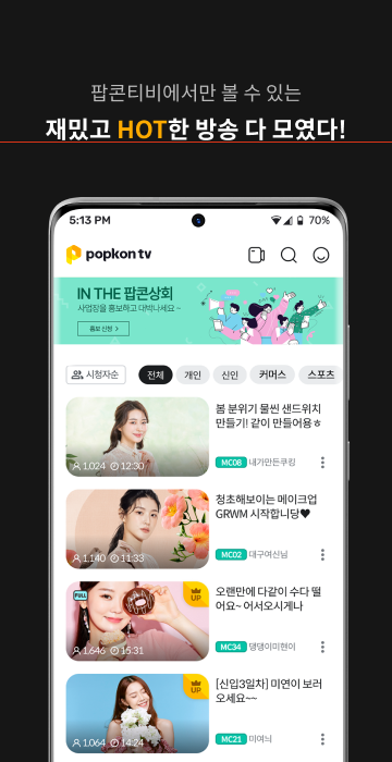 Popcorn TV, qui diffuse des émissions personnelles de BJ populaires en temps réel, offre non seulement une qualité FHD avec une grande clarté, mais également un son et une vidéo de haute qualité. Découvrez-le dès maintenant sur Popcorn TV.