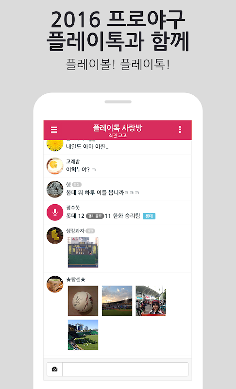- 야구팬들이 구단별 채팅방에 모여서 함께 대화할 수 있어요. 팀별 채팅방에 모여서 우리팀을 응원하세요!