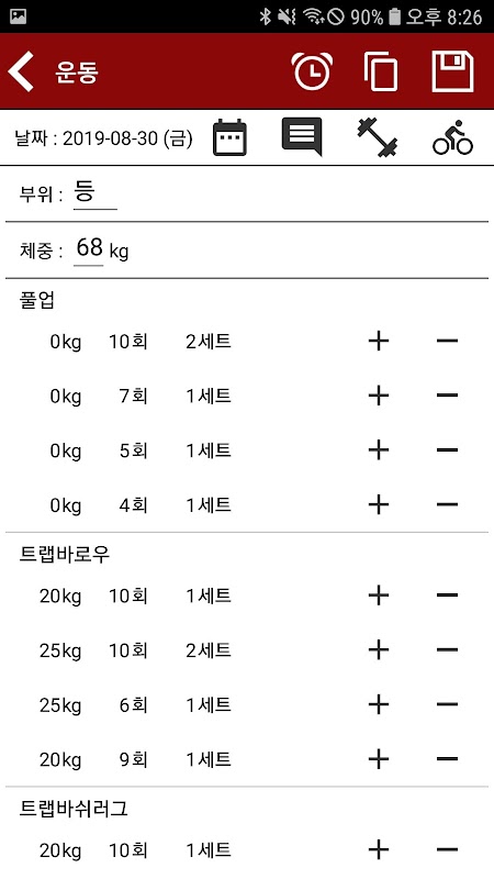 직접 중량운동과 유산소 운동의 세트와 횟수를 입력하여 관리할 수 있습니다.