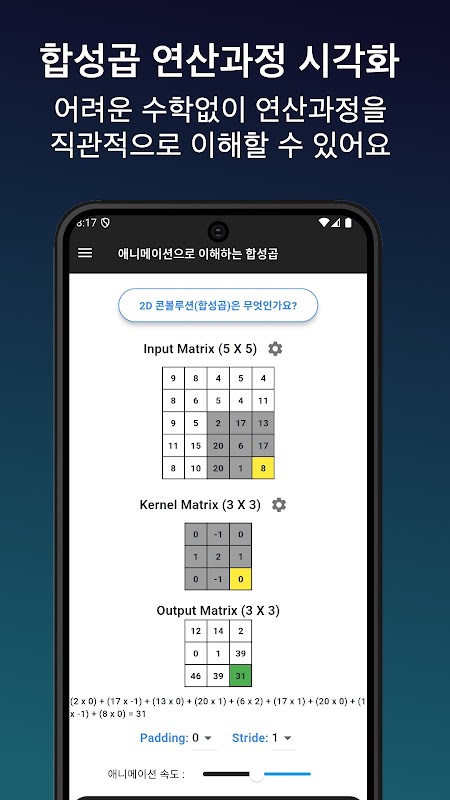 Cette application est un outil d'apprentissage et une plate-forme d'expérimentation utile pour les personnes intéressées par les mathématiques, le traitement d'images, les réseaux de neurones convolutifs (CNN), etc. Cette application utilise l'animation pour expliquer intuitivement les opérations de convolution 2D utilisées en vision par ordinateur et CNN. Même si vous n'êtes pas majeur, vous pouvez comprendre intuitivement grâce à l'animation visuelle, et en même temps, cela offre une expérience d'apprentissage amusante.