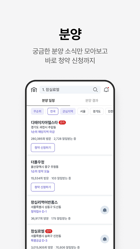 Consultez les prix, les calendriers, les résultats et les tarifs compétitifs des préventes sur Hogangnono. Soyez le premier informé lorsque votre complexe ou quartier est prêt pour la prévente.
