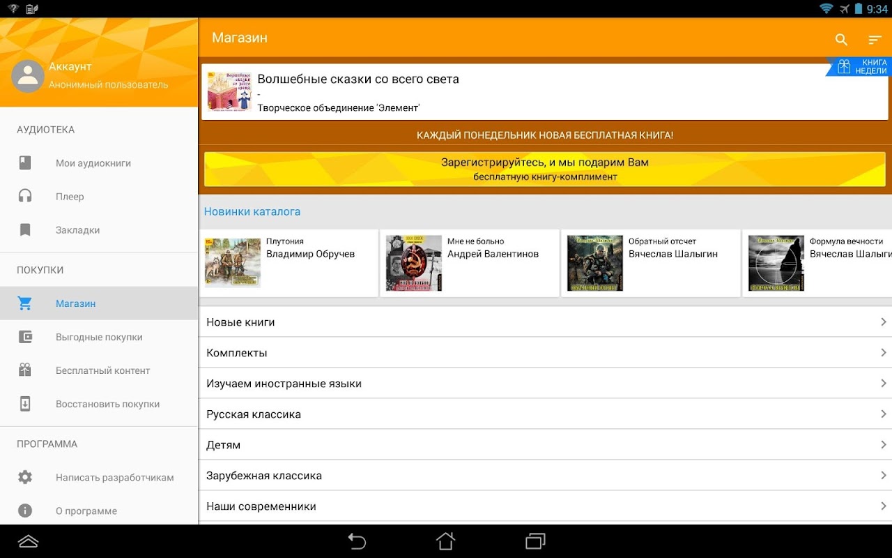 Приложение распространяется бесплатно и представляет собой проигрыватель со встроенным магазином аудиокниг.