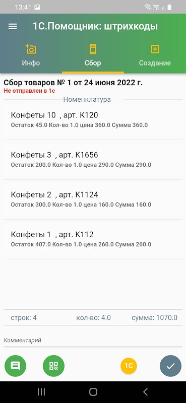 Affichage des informations, collecte et création de marchandises en conjonction avec le système de comptabilité 1C
