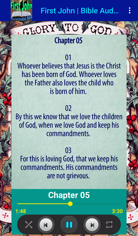 Une application pour tous ceux qui veulent connaître le christianisme directement à partir de la source (Bible). Profitez du chapitre complet de First John (La première épître de Jean) en audio de bonne qualité avec transcription (texte). Profitez de la beauté de la parole de Dieu à tout moment et partout - même sans connexion Internet (hors ligne) - via votre gadget Android. Cette application vous présente le chapitre complet de First John basé sur World English Bible (WEB). Vous pouvez profiter de tout cela de manière rapide, simple et facile. Un must pour l'âme chrétienne dévouée.