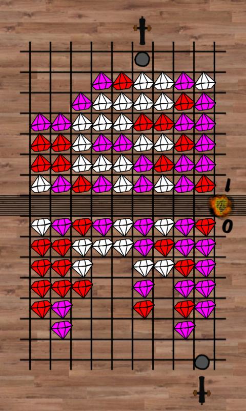 The diamants spawn synchron and beginning from the middle. Both cannons shot synchron, too. The shot duration and the respawn duration decrease from time to time. The cannon angle is changed by touching in your diamants zone and the position by touching the bottom zone. As an diamant get pushed over the last field you lose. If you survive over 100 seconds an 4. golden diamant will be added. But surviving over 100 seconds is insane.
