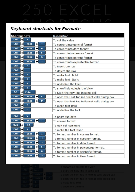 250 raccourcis Excel - l’application vous fournit les touches de raccourci de base et avancées dans Excel,
