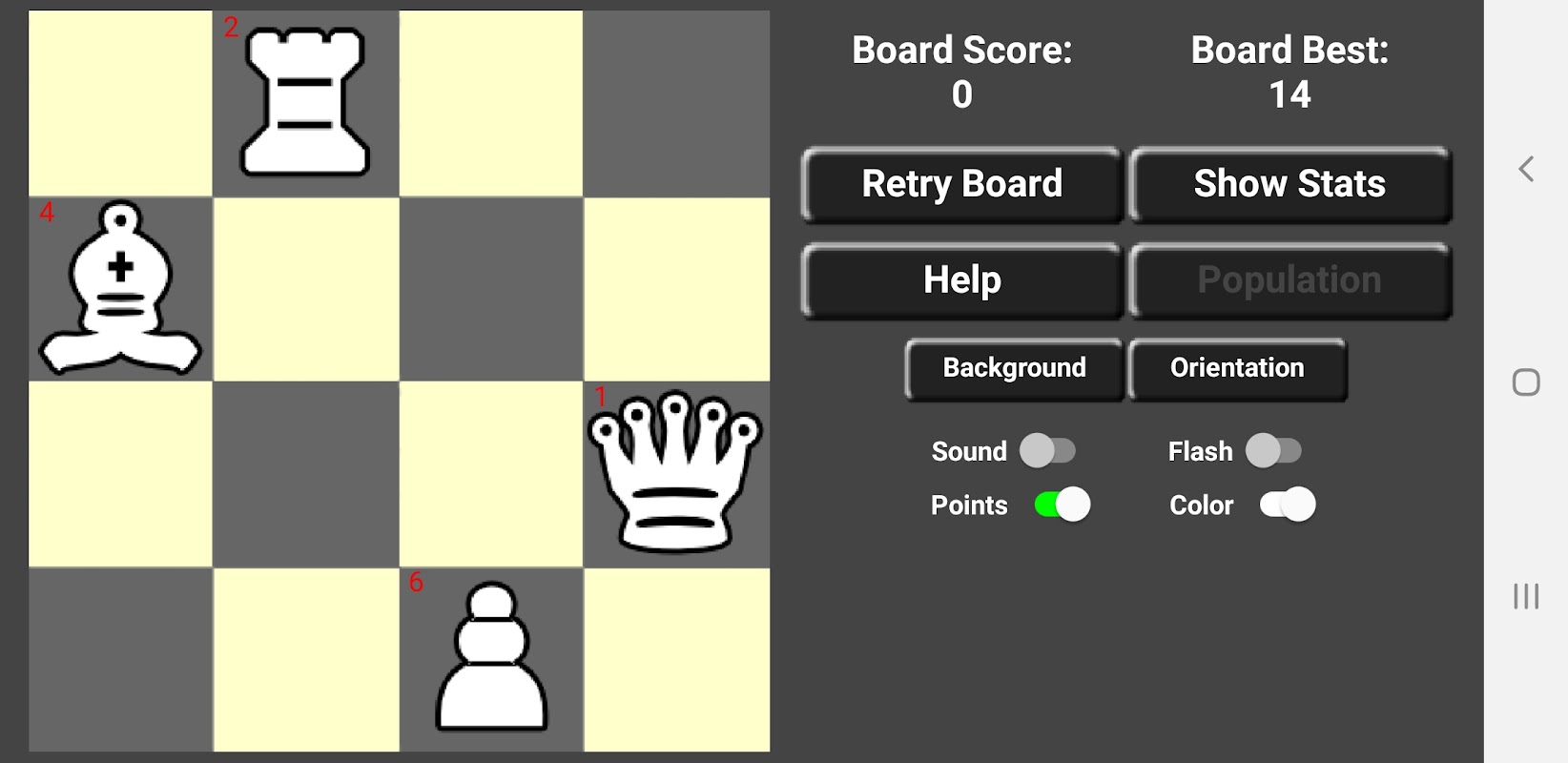 Une approche pour ces échiquiers de réflexion consiste à résoudre l'échiquier par tous les moyens possibles, sans tenir compte du score. Cela vous donnera un objectif à atteindre. Après plusieurs tentatives, vous trouverez souvent d'autres solutions qui vous permettront d'obtenir des scores plus élevés, même de 1 ou 2 points seulement, voire parfois jusqu'à 8 ou 10 points. Vous pouvez réessayer un échiquier autant de fois que vous le souhaitez.