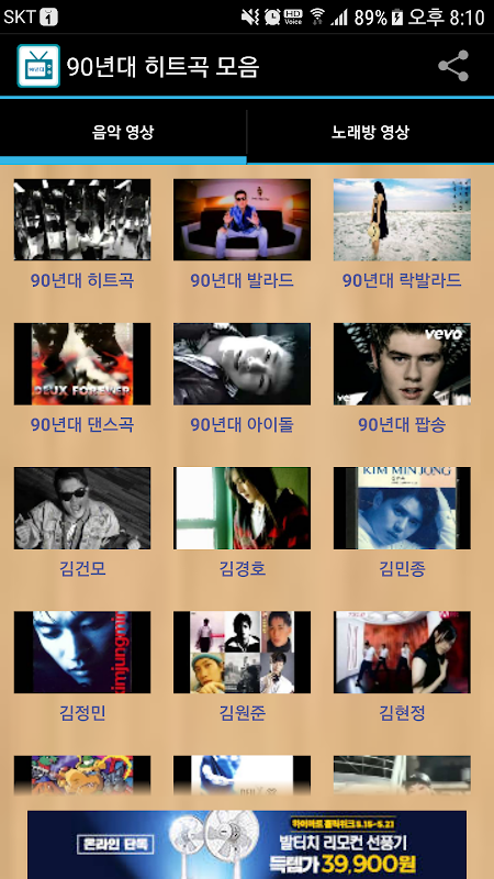 음악 영상 - 가수 별로 히트곡들을 모아 놓아 좋아하는 가수의 노래를 들을 수 있습니다.