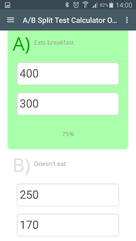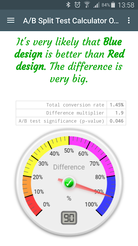 Cet A / B calculateur de split test libre de AnswerMiner indique si le cas A ou B est meilleur cas. Tests AB est facile avec cet outil. En outre, il montre comment assurer qu'il est qu'il ya une réelle différence entre les deux cas et il n'y a pas que le travail de coïncidence. Le niveau de sécurité est élevé, plus la sûreté pour vous sur le fait que l'un est meilleur que l'autre. Tout le monde doit meassure sûreté, la sécurité, la confiance des résultats.