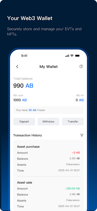 ABE intègre les technologies EVT (Encrypted Variable Token) et NFT (Non-Fungible Token) pour permettre aux utilisateurs de naviguer, de visionner, d'enchérir et de vendre.
