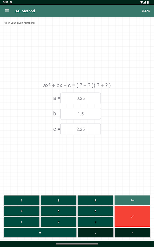 Pour factoriser les quadratiques, cette application utilise la méthode AC. Pour cela, seules trois variables doivent être saisies. La solution est présentée étape par étape. Tous les calculs sont stockés dans l'historique. La solution finale peut être partagée.