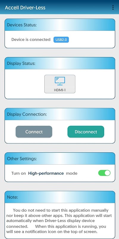 Cette application peut également être utilisée avec le dongle d'affichage USB Accell pour présenter le contenu de l'écran Android à un autre écran, par exemple pour se connecter à un projecteur dans une salle de réunion ou une salle de classe, ou pour se connecter à la télévision dans les chambres d'hôtel.