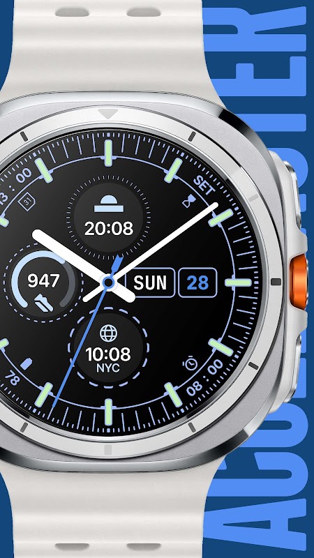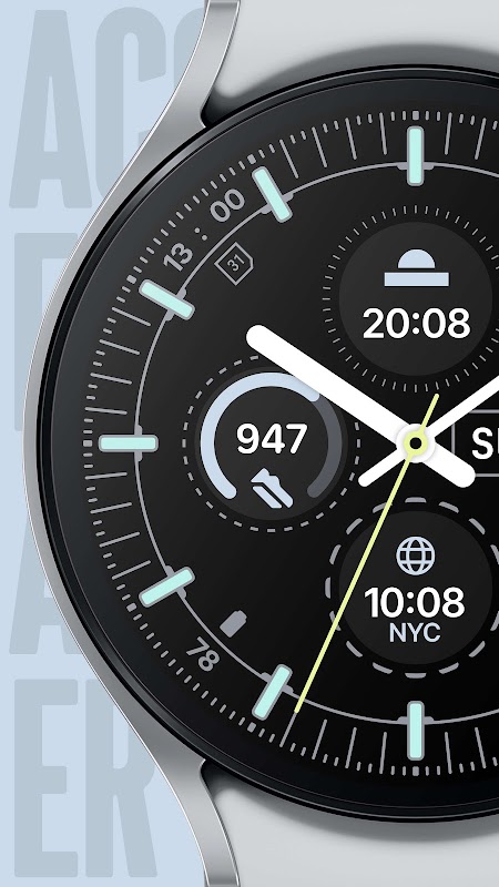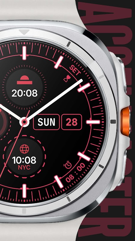 Accelmaster est un cadran de montre analogique audacieux et très informatif, alliant l'esthétique classique du chronomètre de course à un design graphique moderne. Il est conçu pour les utilisateurs qui apprécient à la fois le style et la fonctionnalité, offrant un look dynamique mais minimaliste pour votre appareil Wear OS.