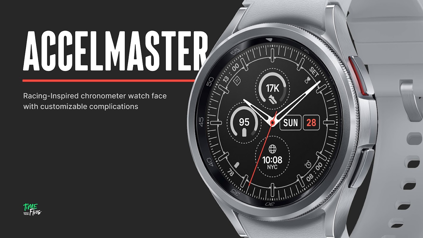 Téléchargez Accelmaster dès aujourd'hui et rehaussez le style de votre montre connectée avec un design élégant inspiré de la course. Avec les cadrans de montre Time Flies, votre expérience de montre connectée est sur le point de monter en flèche.