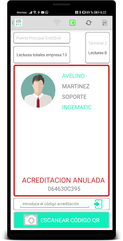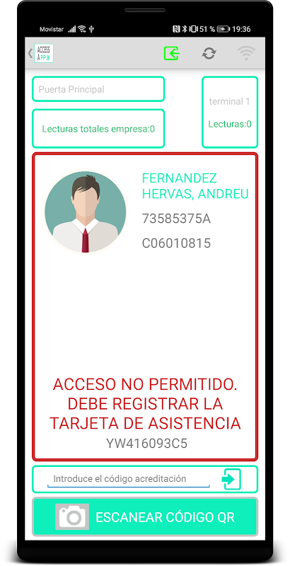 - Recupera los datos de la acreditación con cada fichaje, así como el mensaje devuelto por el sistema de control de accesos. Desde tu panel de administración podrás configurar este tipo de mensajes y crear los tuyos propios.