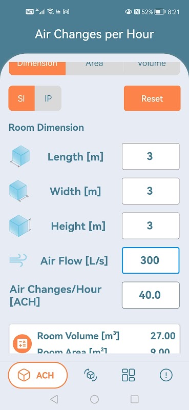 ACH dispose de deux écrans principaux : le premier écran est le calculateur de taux ACH de pièce (changements d'air par heure), où les utilisateurs peuvent calculer rapidement et facilement l'ACH pour une pièce ou un espace. Les utilisateurs ont la possibilité de saisir les dimensions de la pièce, le mode de superficie de la pièce ou mode volume de la pièce. Les champs de saisie intelligents donnent aux utilisateurs la flexibilité de calculer tout paramètre requis en connaissant les paramètres d'équilibre. Le deuxième écran permet à l'utilisateur d'obtenir le débit min. d'air frais ou d'air d'échappement selon la norme ANSI/ASHRAE 62.1-2016, Tableau 6.2.2.1 (pour les taux de ventilation d'air frais minimum requis dans la zone de respiration) et Tableau 6.5 (pour le taux d'échappement minimum). Cette fonctionnalité s'avère bénéfique pour les concepteurs, consultants, entrepreneurs et autres acteurs du secteur CVC.